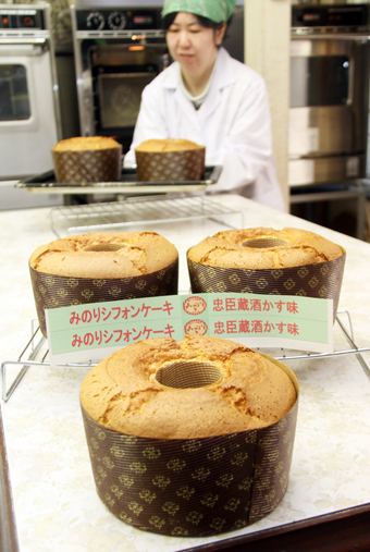 しっかりした質感のパウンドケーキと異なり、ふんわりした焼き上がりが特長で商品名は「みのりシフォンケーキ 忠臣蔵酒かす味」。使用した日本酒と酒かすの分量は子どもでも安心して食べられる程度に抑えている。