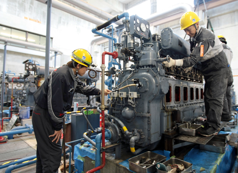 過去にも排水管やケーブルなどの周辺設備については随時補修してきたが、動力機本体のオーバーホールは竣工後初めて。エンジンが据え付けられている建屋2階にポンプメーカーの従業員6人が入り、1機ずつ順番に整備している。