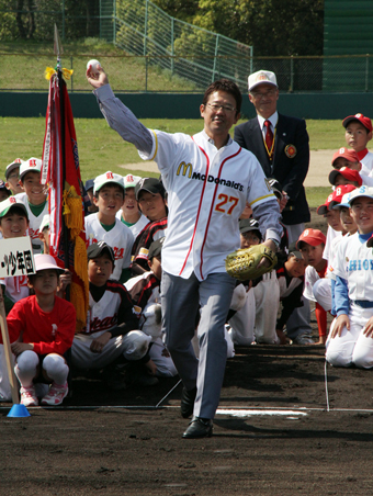 今大会には「市制60周年記念事業」の冠もつけられ、始球式では豆田正明市長が打者、室井久和教育長がキャッチャーに。観衆が注目する中、投じられた一球はストライクゾーンを大きく外れ、古田さんも豆田市長も苦笑いだった。