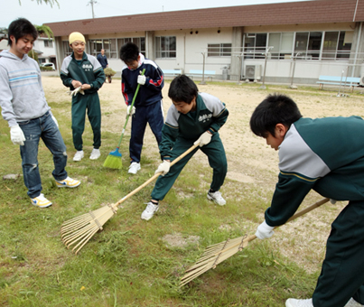 小学生から大人まで約100人が参加。部屋や廊下の窓ふき、庭の除草を実施した。