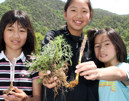 児童らは生育観察のため学校花壇に移植するサンプルを採取。地面から掘り出したハマウツボとカワラヨモギが根でつながっている様子を確認した坂脇桃巴(ももは)さん(12)は「私たちも助け合いを大切にしたいと思った」と話していた。