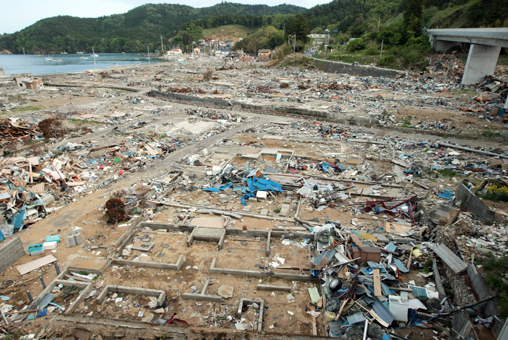 9割近い家屋が流失した石巻市雄勝町水浜地区。写真の左側から高さ20メートルの津波が押し寄せた