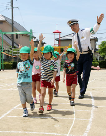 署員らが「信号がチカチカしたら渡ったらあかんで」「青信号でも左右をよく見て」とやさしい口調で指導。子どもたちは教わったとおりに手を上げて横断歩道を渡った。