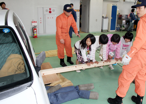 「がんばれ! ちびっこレンジャー部隊」は、オレンジ色の救助服を着用した子どもたちが地上1・5メートルに張ったロープにまたがり、腕の力だけで前進する「セーラー渡過」を体験。救助体験では角材を使ったてこの原理で軽自動車の下敷きになった人形を救け出した。