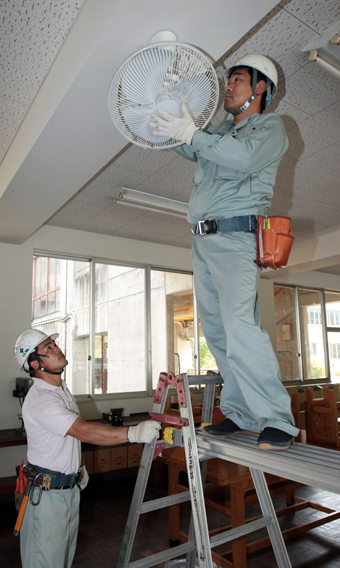 赤穂市内中学校で進められている扇風機の取り付け工事。来年度は小学校にも設置予定