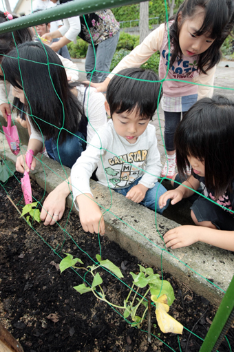 近所に住み、自宅のガーデニングが市主催の「グリーンカーテンコンテスト」で昨年入賞した大和勉さん(65)が葉量の多い宿根種、涼しげな白と青の花が咲く西洋種など自家栽培した苗を提供。親子連れらが20〜30センチ間隔に植栽した。水やりも住民らが協力して世話をし、「できれば今年のコンテストに応募したい」(濱口義信副会長)という。