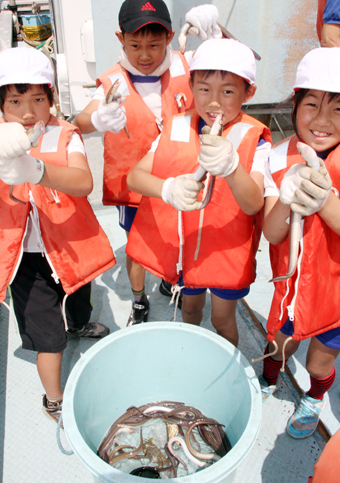 漁船3隻で沖合へ。前日に自分たちで沈めた仕掛けを引っ張り上げると、長さ20―40センチほどのマアナゴがクネクネ。児童たちは「ヌルヌルしとる」「ごっつい元気や」などと言いながら甲板で踊る獲物を氷の入ったバケツに素早く移した。