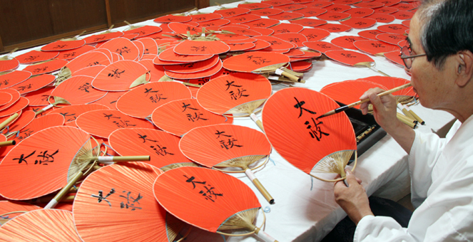 生浪島宮司がうちわに「大祓」または「祓」の文字を毛筆し、柄には祈祷した守り札。大判(縦41センチ、横29センチ)1000円、平柄(縦38センチ、横24センチ)300円で初穂料の一部を東日本大震災の被災地へ義捐金として贈る。