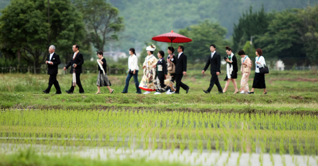 新婦は介添人に左手を預け、ゆっくりと歩を進めた。「松に鶴」の色内掛は祖母と母も婚礼で着た思い出の品。田植えが終わったばかりの水田に華やかな花嫁の姿が映っていた。