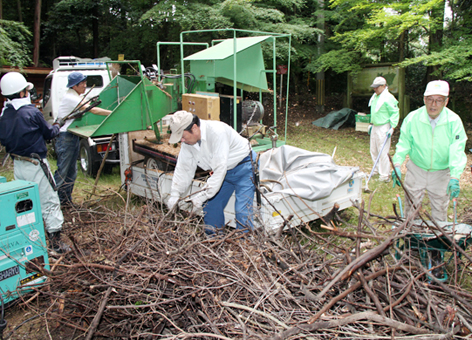 植樹場所に適していそうな場所を探し、倒木や枯れ枝を手分けして除去。集めた細枝や葉は現地に持ち込んだ粉砕器でチップ状に細かくカットして森に散布し、太い幹は処分するために持ち帰った。