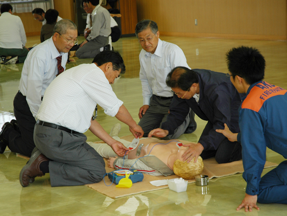 一般市民が受講するのと同じ約3時間の普通救命講習を実施。ビデオと消防職員の説明を受けてから人形を使った訓練を行った。