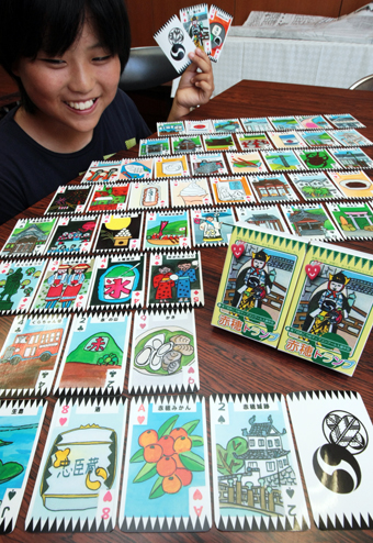 「赤穂は見どころやおいしい食べ物がたくさんあり過ぎて、選ぶのに困った」と作品づくりを振り返る松井さん。「自分の絵が本物のトランプになって夢みたい」とうれしそう。有志グループ代表の和田祥平さん(27)=市税務課職員=は「これで旅の思い出を味わって、再び赤穂に足を運んでもらえれば」と話している。