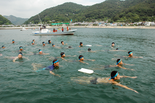 明治・大正に行われていた「海上運動会」がルーツ。昭和55年に現在の形で復活した。 児童たちは行事の歴史についてOBや地域の大人から聞き取り。3日前からは学校プールで本番を想定した長距離泳を行い、当日に備えた。