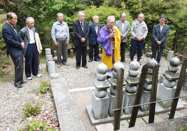 墓前祭は高徳の祥月にちなんで毎年5月に行われ、今年も「児島高徳卿顕彰会」の会員らが参列した。墓所前での法要に続いて北東80メートルほどにある遥拝所で神事。しめ縄を結んだ真新しい石柱の前に旧家の奥藤家が代々管理している三種の神器を並べ、参列者らが玉串を奉納した。
