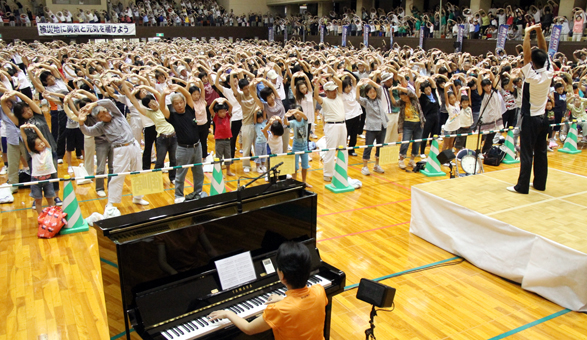 リハーサルを経て午前6時半から中継開始。参加者はピアノの生伴奏に合わせて元気に体を動かした。母と弟の家族3人で参加した片浜町の小学5年、笠井美咲さん(10)は「こんなに大勢で体操したのは初めて。気持ちがよかった」と話していた。
