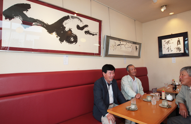 4月は平成町の千崎勝廣さんのスプレー絵画を紹介。今月は北野中の書道家・新家一夫さんの作品13点を掲げ、古典と前衛が融合した作風が目を引いている。