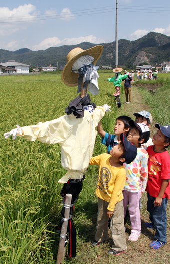 米作り体験は同校で20年以上続く伝統行事。かかし作りは低学年児童の受け持ちとなっている。