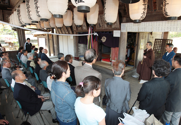 当日は観音堂の柱に浅野家の家紋を染めた幔幕が張られ、花岳寺の片山一良住職が読経。赤穂からも同寺総代の前川渉さんらが参列し、金色に輝く秘仏を拝んだ。