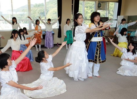 6月に配役を決め、夏休みもほぼ毎日学校に集まった。部員同士ですべて考えた振り付けを繰り返し練習。公演2週間前からは衣裳を着けての通し稽古で細部を詰めてきた。