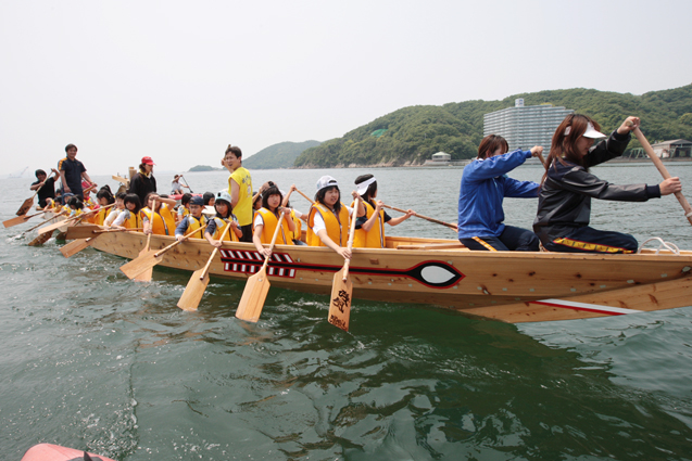 太鼓の音に合わせてオールを動かすと、30人以上が乗った船がゆっくりと動き出し、徐々にスピードアップ。「ヨーイヤサー」の掛け声で生島を一周した。