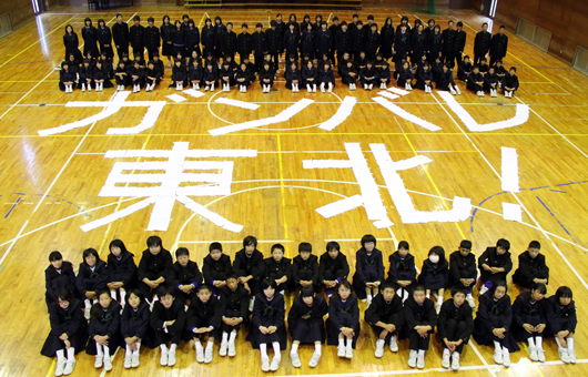 10月31日には出来上がった雑巾260枚を「ガンバレ東北!」の文字になるように体育館の床に並べて記念撮影。この写真も雑巾と一緒に送るという。