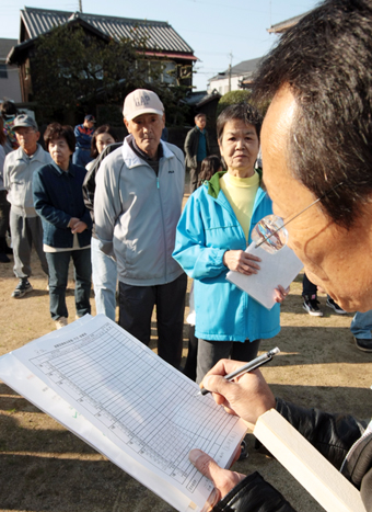 消防団が車両スピーカーで避難準備を呼びかけ、各組の班長が世帯台帳を基に人数をチェック。9時半までに全9組が避難を完了した。
