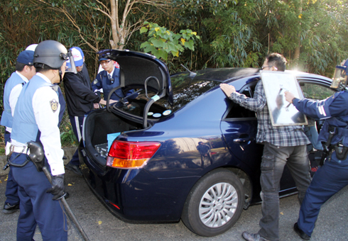 「けん銃と刃物を持った男2人組が大津の山陽道赤穂インター料金所から現金入りジュラルミンケースを奪って車で逃走」したとの想定で約40人が参加した。「事件発生」の第一報を受けた赤穂署が市内6カ所に署員を緊急配備。備前署は県境の福浦峠に検問を設置した。警ら中のパトカーが国道250号を西進している不審車両を福浦峠に追い込み、発生から約1時間後に「逮捕」した。