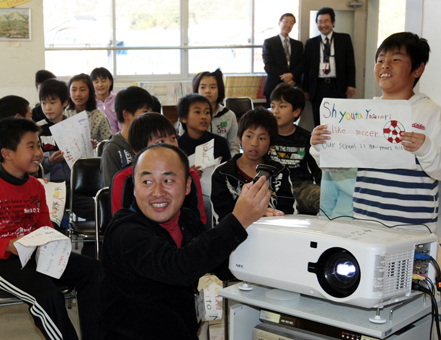 無料通信ソフトで双方の教室をネット接続。児童たちは名前や特技などをマジックで書いた画用紙を持ってカメラの前に立ち、一人ずつ英語で自己紹介した。スクリーンに映し出された相手先の映像を見ながら、共同制作する壁画のデザインについても意見交換。高雄小は両国の地図を虹の架け橋でつなぐ図柄を提案し、カンダンガンの児童からは「互いの学校や動物を絵に盛り込みたい」とアイデアが出た。