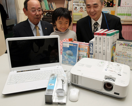 聴覚障害者支援NPO「デフピープル」の助成金を活用。同日の贈呈式には1年生74人が参加し、山本会長が「みんなで仲良く使って、しっかり勉強してください」とあいさつした。