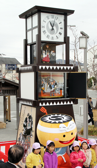 式典は午前10時45分から始まり、豆田正明市長は「地域のシンボルとして愛され、にぎわいづくりに寄与することを願っています」とあいさつ。赤穂保育所の園児らと一緒に紅白のロープを引いた。この日が“初仕事”となった観光マスコット「陣たくん」も登場し、愛きょうを振りまいた。