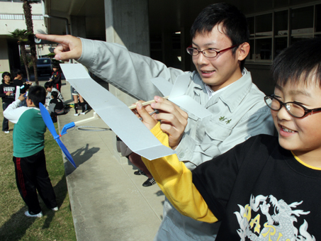 児童たちはさっそく屋外で飛行テスト。中庭に向けて手放した機体は曲線を描いて上昇し、旋回しながら滞空した。高校生のアドバイスで主翼の位置や角度を調整すると、見違えるぐらい飛ぶようになったものもあった。