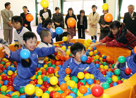 「30年以上使い続けていたボールプールが老朽化していた。今回の寄贈は大変ありがたい」と沖汐守彦校長(54)。贈呈式後、さっそく中で遊ぶ子どもたちを見た光都LCの嶋田由美子副会長は「楽しんでくれて大変うれしいです。長く大切に使って下さい」と話していた。