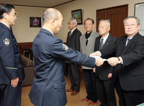 連日の年末特別警戒に当たっている署員を励まそうと、吉村武久専務理事、「赤穂地区警察官友の会」の井上勇会長ら6人で訪問。「寒さに負けずにがんばって」と栄養ドリンク200本も届けた。