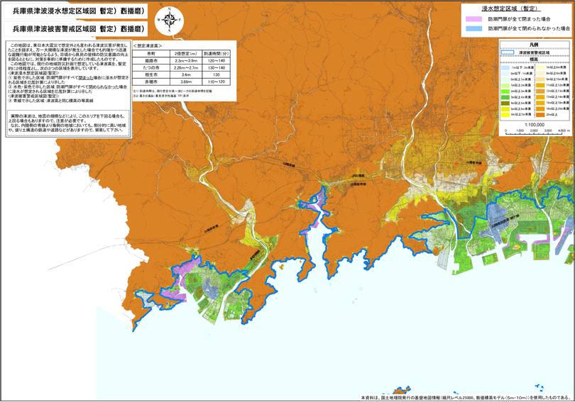 「津波浸水想定区域図」(暫定版)の西播磨版。紫色のエリアは防潮門扉が全てしまった場合でも浸水するとの想定。防潮門扉が開放されたままだと、紫色の部分だけでなく青色のエリアも浸水する。その他の色は標高を表す。