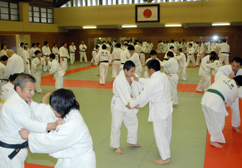 太鼓の合図で一斉に乱取り、打ち込みを開始。威勢のよい掛け声や受け身で畳をたたく音が道場に響いた。