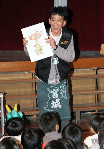 この日は宮城県で被災者からもらったという前掛けをして児童たちの前に立った。自分が被災したとき、「頑張れ、頑張れと言われ、どこまでやればいいのか辛かった」という瀧ノ内さん。「先生、休んでコーヒー飲み」とボランティアにかけられた一言で気持ちが楽になったと振り返った。「相手の話を遮らずに聞くことが心のケアにつながる」とEARTHの活動を通して学んだことも語り、「寄り添うことが大切。『しなければならないこと』ではなく、『できること』を考えて」と呼びかけた。