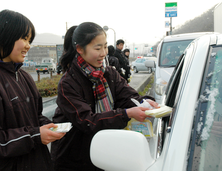 約130セットを用意し、小雪が降る中を30分間ほど配布。2年の宮本良輔君(14)は「僕たちも事故に遭わないように気をつけて自転車に乗るようにします」と話していた。