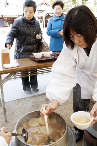 「義士の命日を知ってもらいたい」(飯尾宮司)との思いで平成17年から毎年、神前に供えた“厄除け大根”を提供している。今年も赤穂産ダイコン約130本を輪切りにし、カツオ、シイタケなどで取っただしで煮込んだ。