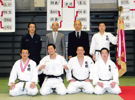 県警柔道で2年ぶり3度目の優勝に輝いた赤穂署の柔道選手団