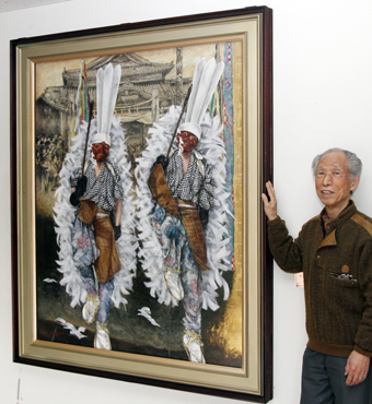 寄贈されたのは、4年前の「一陽展」に出品した100号(縦約1・6メートル、横約1・3メートル)の大作で、タイトルは「天狗(’08―祭日)」。赤穂八幡宮の秋祭りをモチーフとし、片足を高く上げて舞う鼻高2体を躍動感のあるタッチで描いた。背景の社殿をセピア調にすることによって祭礼の伝統を表現している。