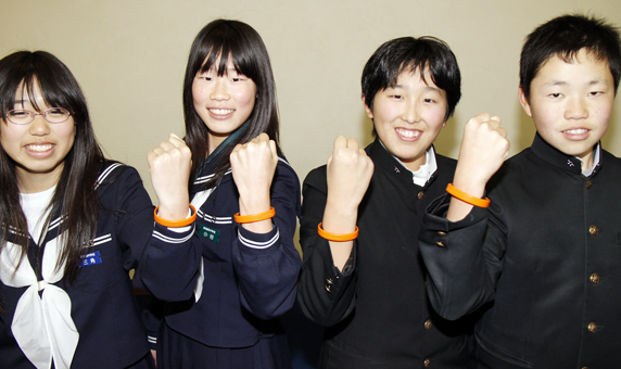 昨年の慰問に参加した際、「うまく話せなかった」という2年生の石堂里沙さん(14)は「今度は大丈夫」と手首のリングを友達と見せ合っていた。