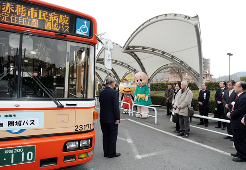 この日は第一便の運行に合わせて上郡駅で出発式。到着地の赤穂市民病院でも病院職員など関係者約20人が出迎え、記念式典が行われた。豆田正明市長が「圏域の足としてみなさんに大いに利用していただきたい」と祝辞。乗客への記念品が藤本敏弘議長から手渡された。