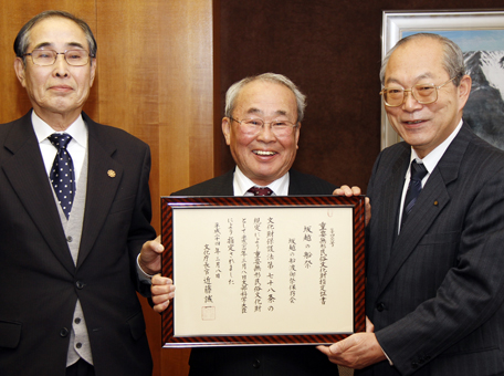 交付式には、「坂越の船渡御祭保存会」の篠原明会長(75)と大避神社の生浪島堯宮司(68)が出席。9日には証書を持って市役所を訪問し、豆田正明市長に喜びの報告を行った。