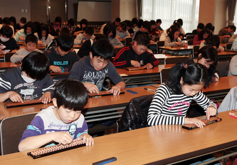 乗算、除算、見取暗算、見取算の4種目合計で競う総合競技から実施。始めの合図で一斉に問題用紙に向き合い、会場にはパチパチと玉を弾く音が響いた。種目別競技は読上算と読上暗算の2つを行い、それぞれ上位を表彰した。