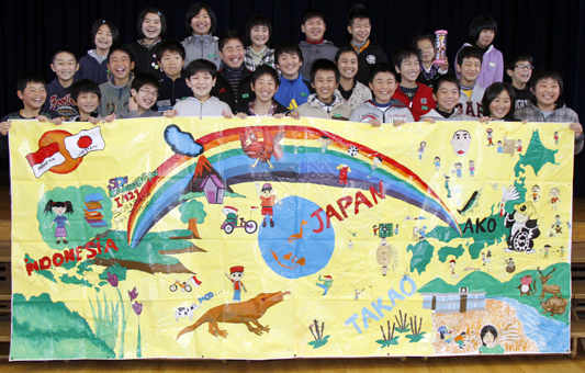 同校は「ジャパンアートマイル」(事務局・赤穂市、塩飽隆子代表)の支援でインドネシア・スマトラのカンダンガン小学校と昨年11月にテレビ会議。構図を相談し、テーマを「国は違ってもともだち」に決定した。