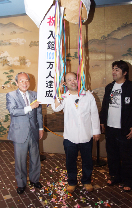 「おめでとうございます。あなたが100万人目の来場者です」と声をかけられ、豆田正明市長から認定証と記念品の雲火焼などが贈られた。