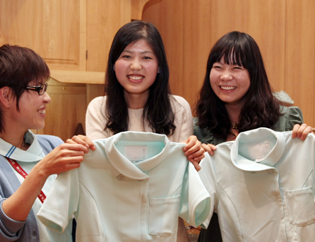 あこがれのナース服を手に国家試験合格を祝福される陳偉さん(中)と王セイさん(右)