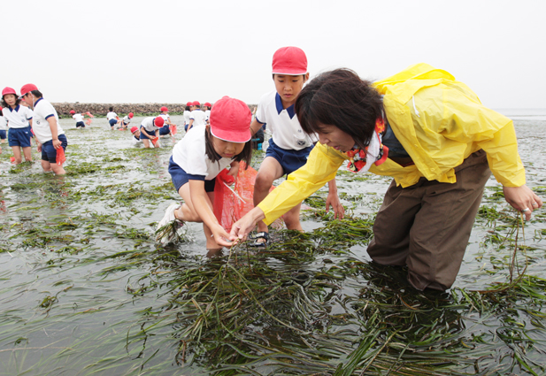 この日は午後1時から2時にかけて沖合い約150メートルの辺りまで子どものひざぐらいの潮位。子どもたちは海面にたなびく海草に目を凝らし、種を含んで稲穂状になった茎を探した。
