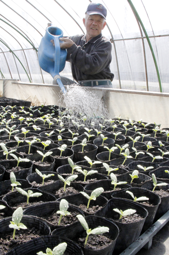 農業歴60年以上のベテラン、樋本實さん(82)=南野中=が引き受け、先月中旬にハウス内の畑へ播種。高温を好むメロンの特性に合わせてビニールや毛布で保温し、一週間後に黄緑色の子葉が土から顔を出した。一株ずつポットに植え替えられた苗は10センチ近い高さまで伸長し、間もなく定植に適したサイズになるという。