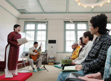 2回公演で計約160人が来場。午前の部を夫婦で鑑賞した正保橋町の入江良子さん(59)は「建物の雰囲気に歌声とギターがマッチして、とても素敵でした」とステージへ拍手を送っていた。